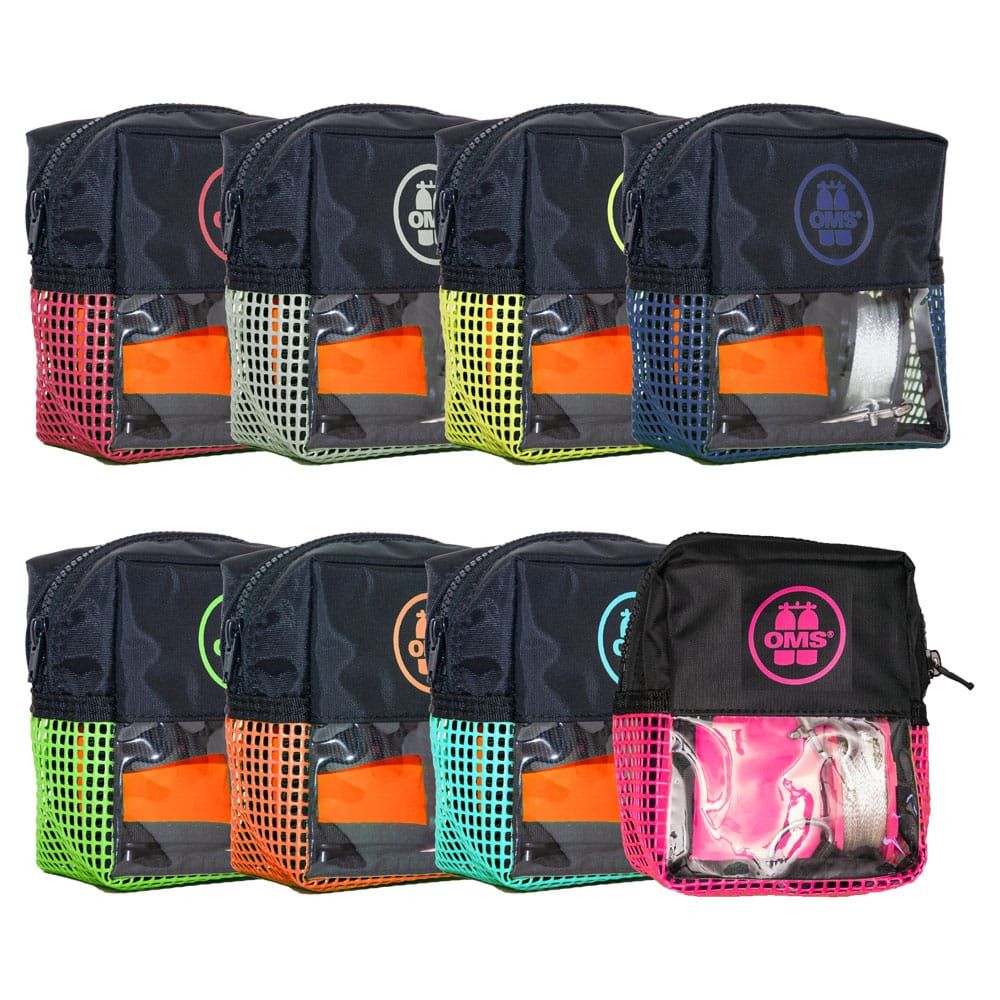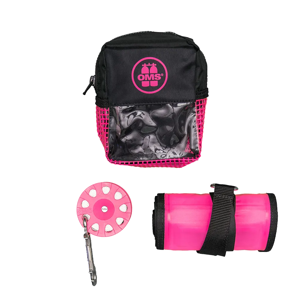 The Safety Sets contain a small mesh carrying bag-Safety Pocket, an OMS Surface Marking Buoy (SMB) and a Finger Spool with a stainless steel BigGripยฎ Double Ender.