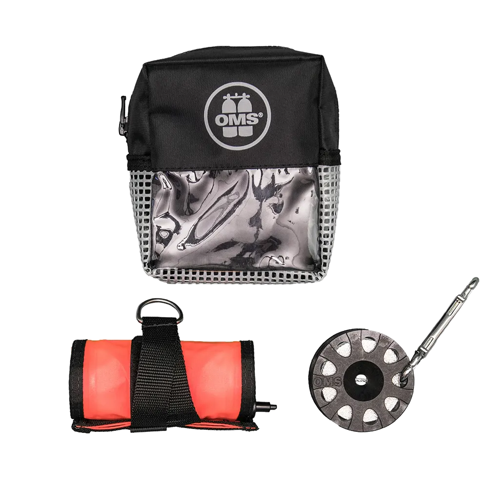 The Safety Sets contain a small mesh carrying bag-Safety Pocket, an OMS Surface Marking Buoy (SMB) and a Finger Spool with a stainless steel BigGrip® Double Ender.