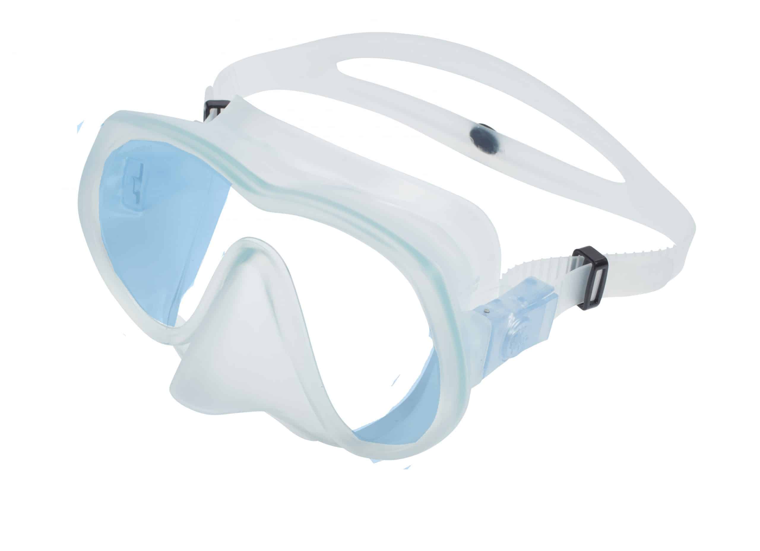 The Tattoo Mask Tin blue is a one window frameless mask with ultra-low volume. The Black standard skirt size is called Western (W) and is available in an additional smaller size called Asian (A) to accommodate a range of face sizes